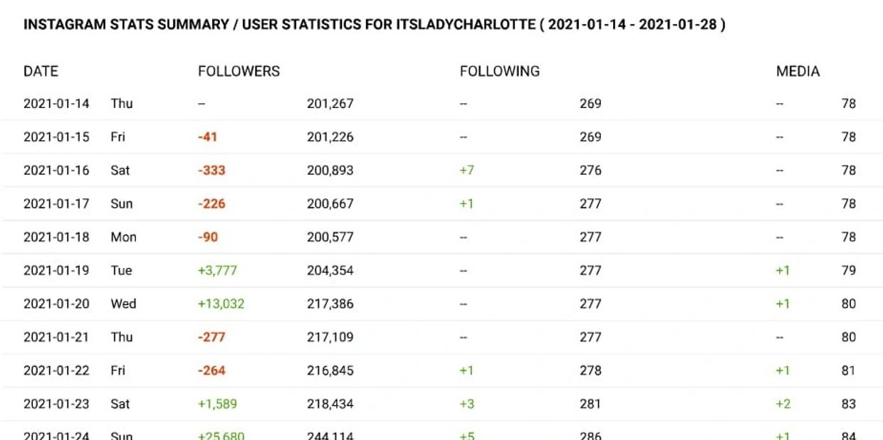 Investigations also reveal that her social media account on instagram is artificially inflated, as she has "bought" instagram followers, rather than having natural and real friends and followers.